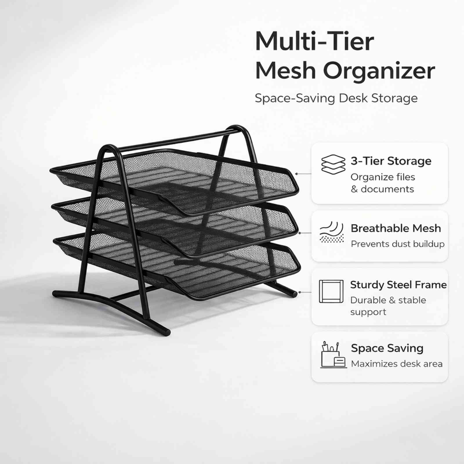 Elevate your workspace with the FlowStack 3- tier organizer, a perfect blend of functionality, modern aesthetics, and premium durability. Designed with a sleek metal mesh construction, this organizer ensures your files, folders, and papers stay neatly in place while adding a touch of sophistication to any office or home desk.