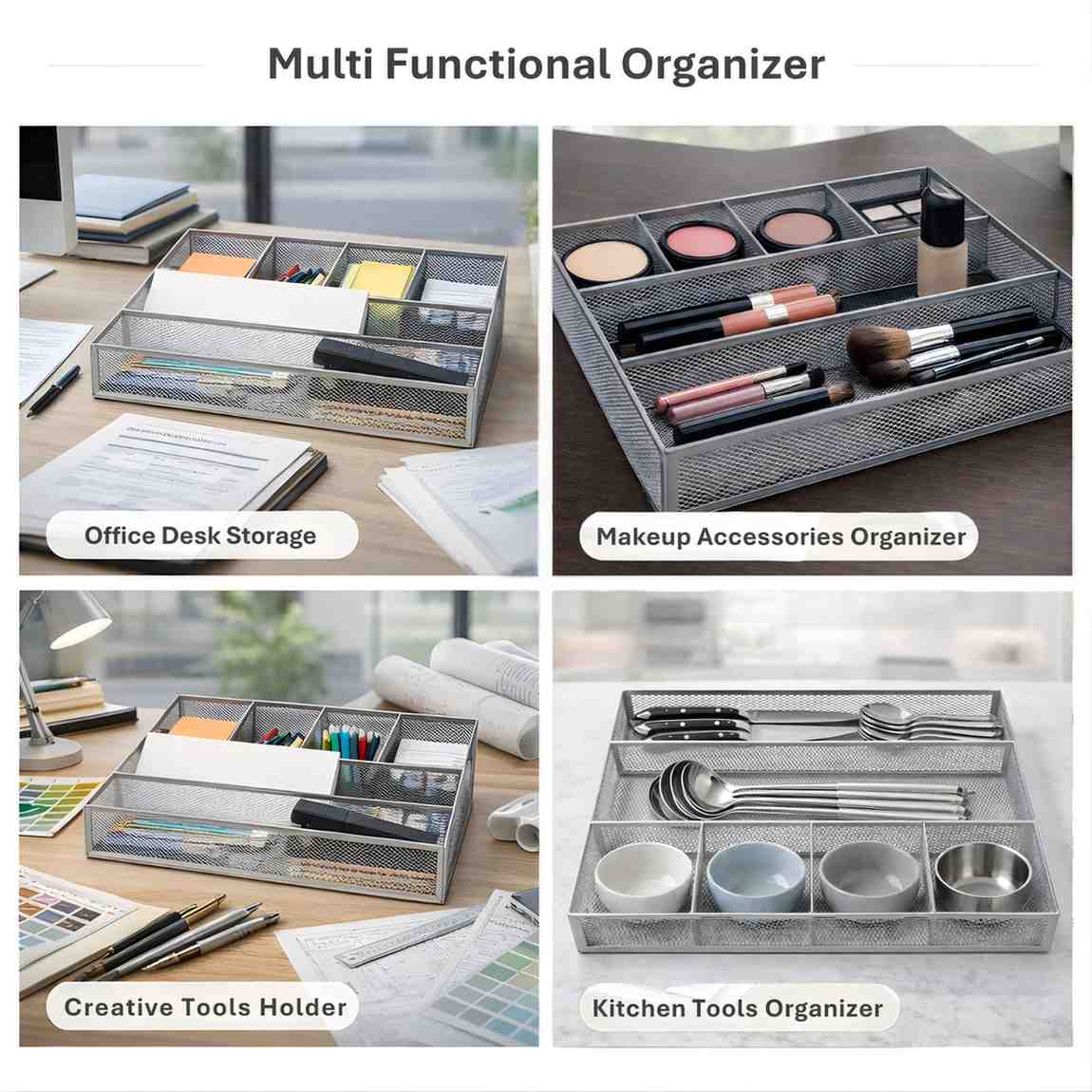 Crafted from premium-quality mesh steel, this organizer is durable, lightweight, and built to withstand daily use. Its multi-compartment layout is perfect for neatly arranging stationery, office supplies, cutlery, cosmetics, or small household essentials. Whether in the office, home, or studio, GridMate ensures clutter-free drawers that boost productivity and style.