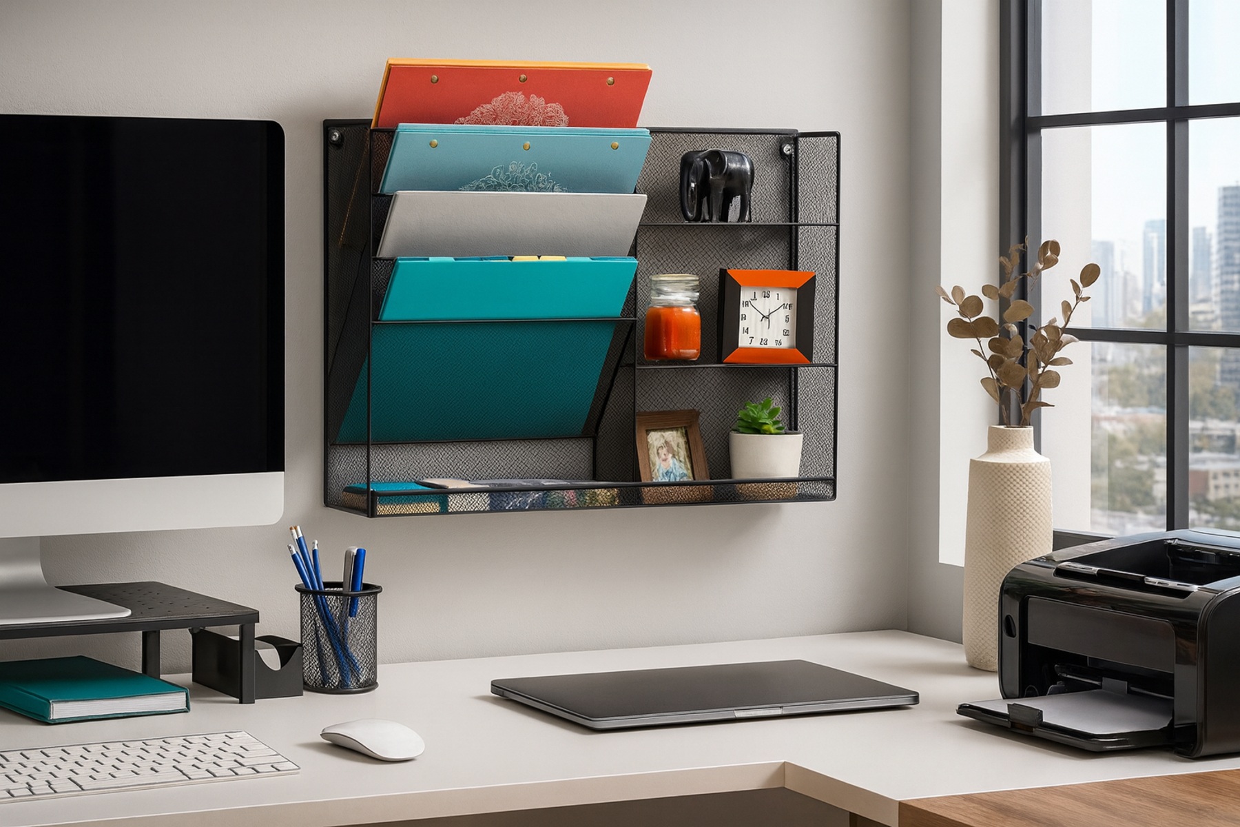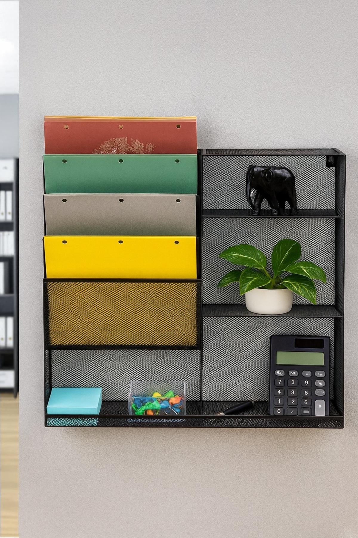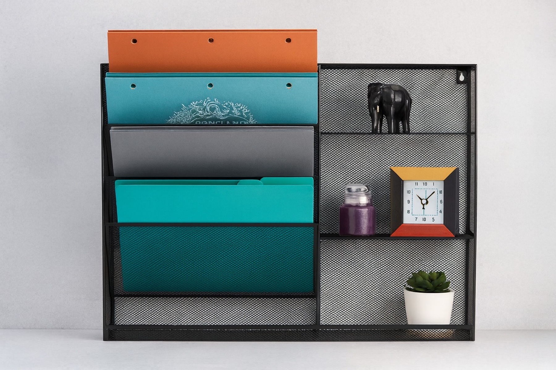 With four angled compartments, a flat bottom tray, and three additional shelves, this organizer provides ample room for everything from files and notebooks to staplers, markers, and sticky notes. Whether mounted on a wall or placed on your desk, it saves space while keeping your essentials accessible and visible.
