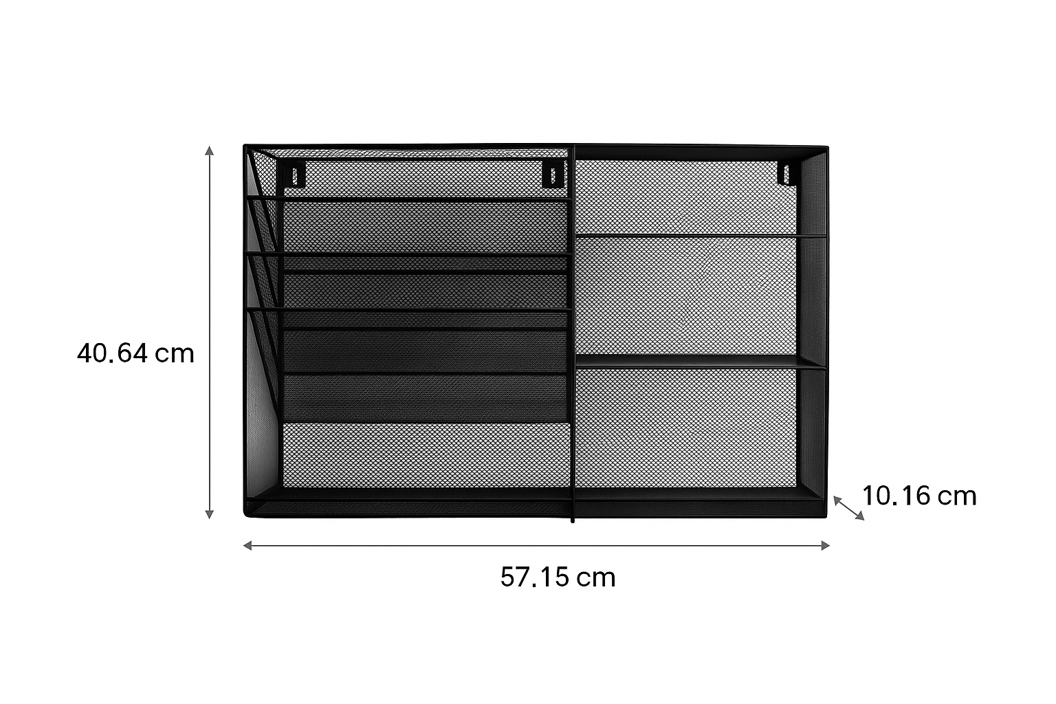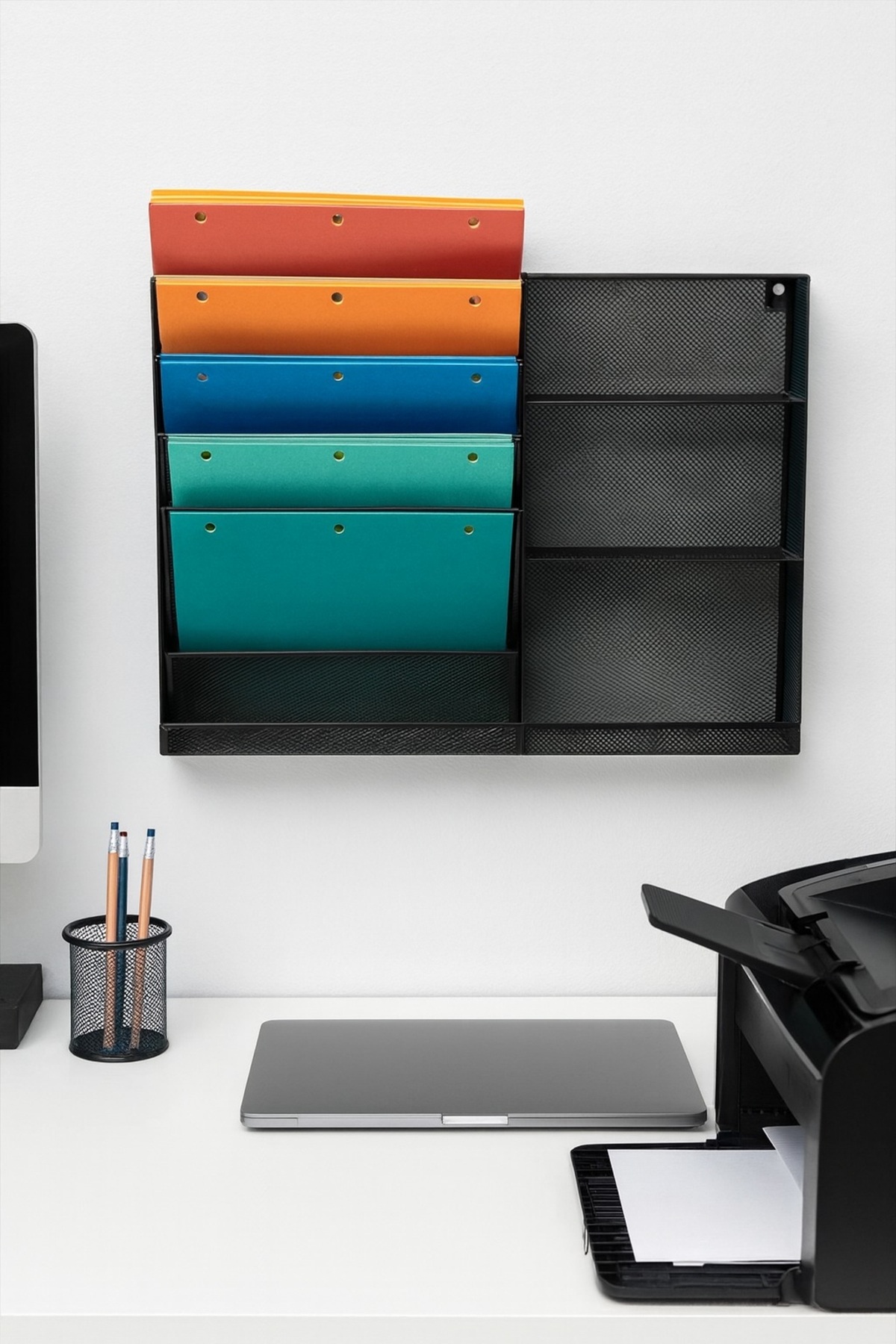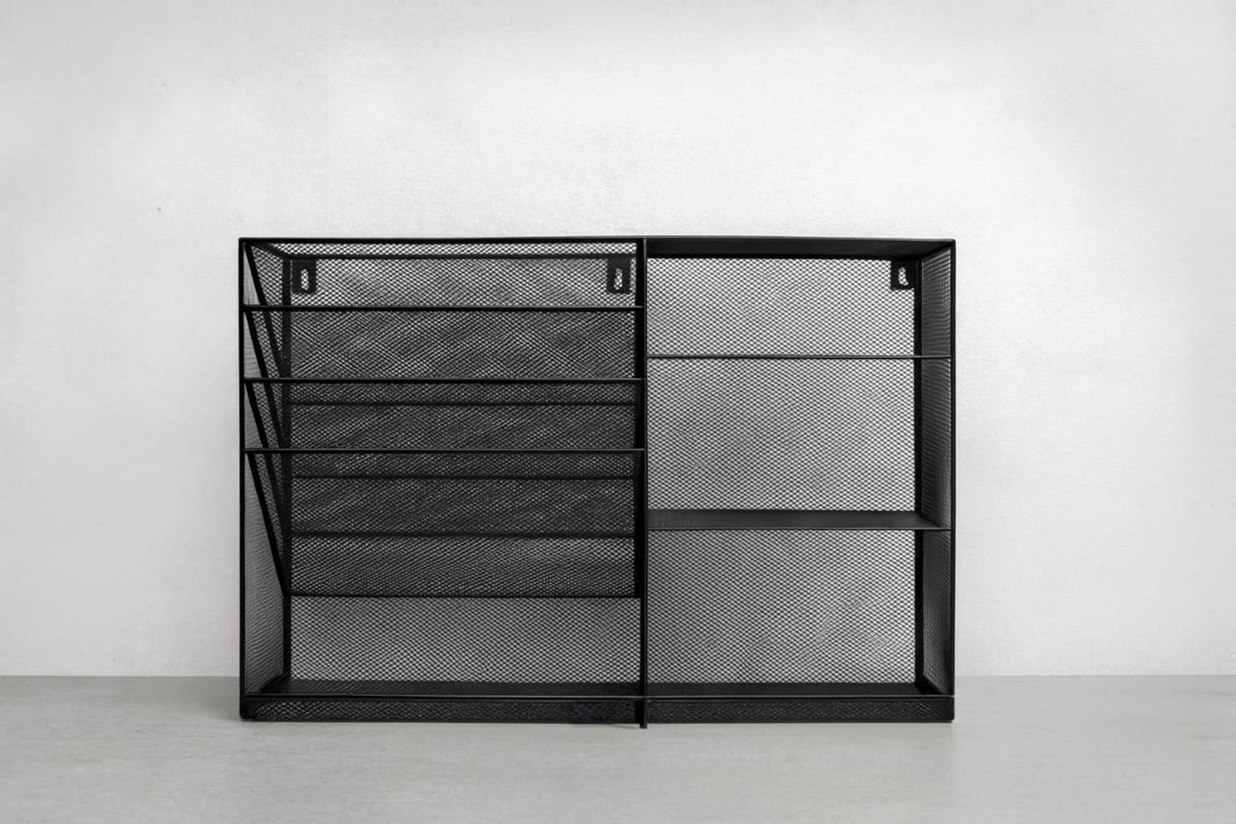 With four angled compartments, a flat bottom tray, and three additional shelves, this organizer provides ample room for everything from files and notebooks to staplers, markers, and sticky notes. Whether mounted on a wall or placed on your desk, it saves space while keeping your essentials accessible and visible.