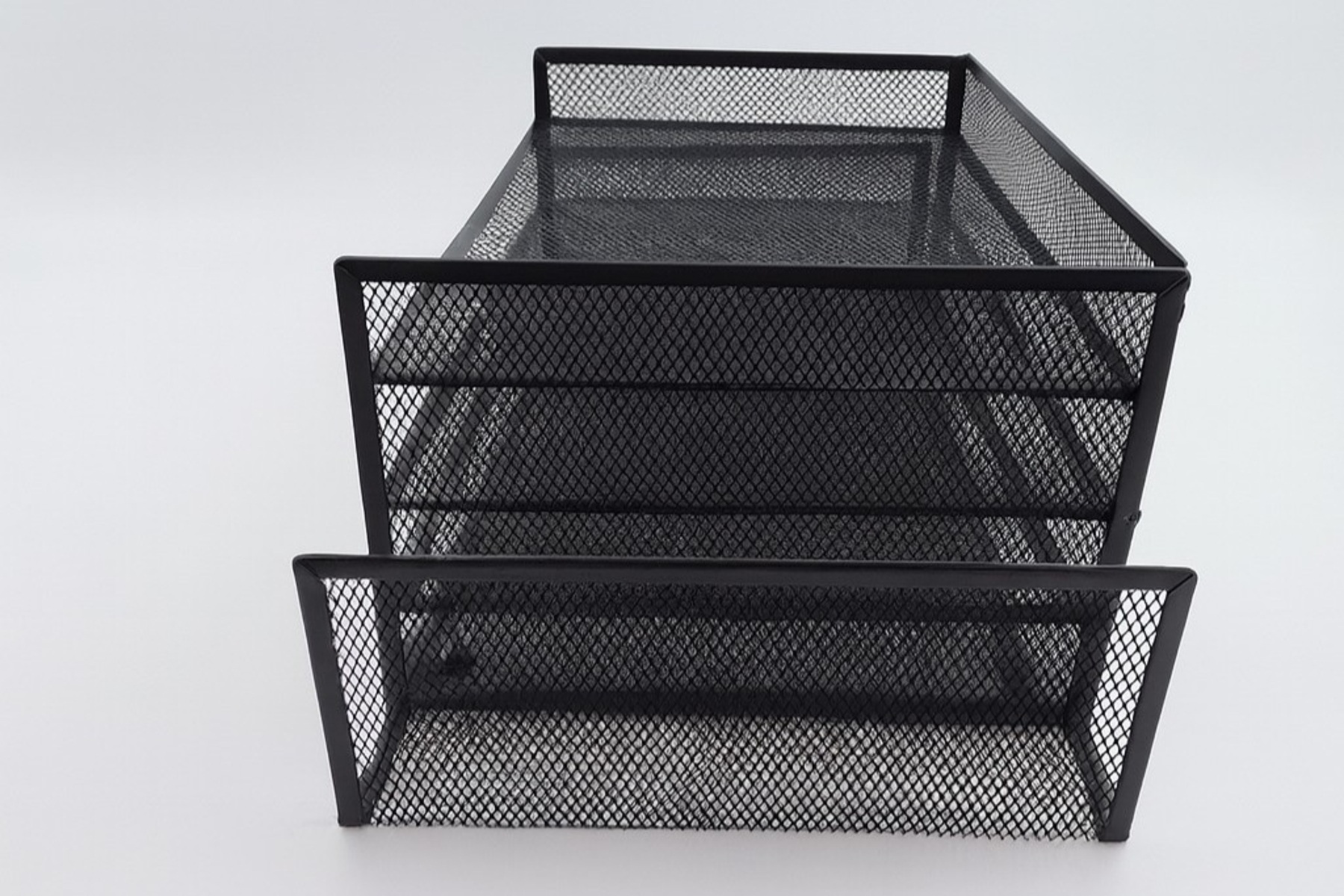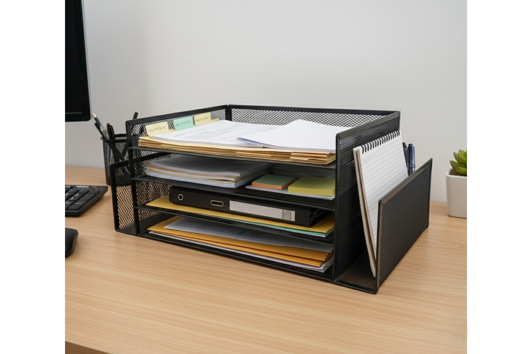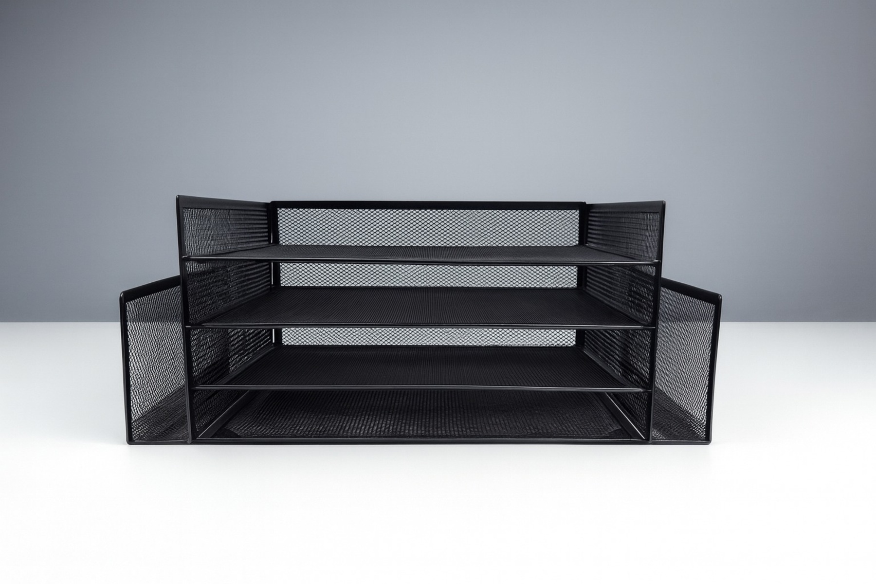 Crafted from durable metal mesh with a sleek powder-coated finish, this organizer offers multiple compartments and tiered trays for easy sorting and quick access. Its sturdy design ensures long-lasting use, while its modern look complements any office or home workspace.